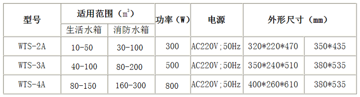 內(nèi)置式水箱自潔消毒器(WTS-2A)由電控柜和循環(huán)反應(yīng)器兩部分組成,控制柜安裝在水箱外部,循環(huán)反應(yīng)器放置在水箱內(nèi)部,兩者之間由管路及電纜連接。